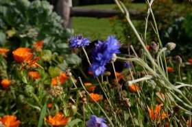 Mit viel Geschick sind die Pflanzen gewählt, gekonnt nebeneinander gepflanzt, sodass sich die Pflanzen gegenseitig schützen und stützen, Tiefwurzler mit Flachwurzlern in einer Reihe. Zwischen den Gemüsereihen sprießen duftende Kräutermischungen, üppige, bunte Zierpflanzen säumen die Beete und ziehen viele Bienen und nützliche Insekten an. Das Insektenhotel bietet den kleinen Tierchen einen geeigneten Lebensraum. An heißen Tagen schwirrt und summt es zur Freude für die Umwelt.